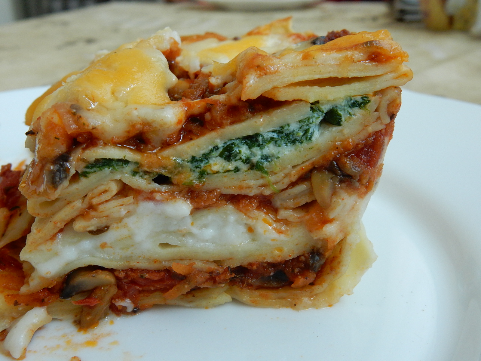 A gombát megtisztítottam, összevágtam apróra, ugyanígy a hagymát és a fokhagymát is. A sárgarépát megtisztítottam és lereszeltem. Egy serpenyőbe öntöttem egy kevés olajat, majd a hagymát, fokhagymát és sárgarépát odatettem pirítani. Amikor már megpuhult, felöntöttem a konzerv paradicsommal, fűszereztem és főztem még együtt kb 20 percet. Közben a spenótot és megtisztítottam a vastag levélnyéltől, mostam, lecsöpögtettem. Egy másik edényben kevés olajon megfuttattam, amíg össze nem esett, majd fűszereztem sóval, fehér borssal és szárított fokhagymával. Amikor kihűlt kissé, hozzátettem a ricottát és egy villa segítségével jól elkevertem. A besamelt a szokásos módon elkészítettem, vajban megfuttattam a lisztet, majd adagonként hozzáöntöttem a tejet is, csomómentesre kevertem. Sóztam és egy kevés szerecsendiót is reszeltem bele. Miután mindennel elkészültem, jöhetett a tészta kinyújtása. 3 egyforma darabra vágtam a téglalap alakra formázott tésztát, majd a tésztagép segítségével vékonyra nyújtottam. Azért választottam ezt a módszer, mert így már eleve szalagokat kapok, amit utána könnyen formára tudok darabolni, másrészt pedig a gép valóban egyenletesre nyújtja a tésztát. Itt következett a dilemmám, főzzem-e ki előre a tésztát, vagy bízzam a sütőre? Döntöttem, előfőzöm, de éppen hogy. Mivel ebben nem volt eddig túl sok rutinom, így nem egyesével terítettem ki a lapokat egy konyharuhára, miután kiszedtem a vízből, össze is ragadt alaposan, meg kellett dolgoznom a végeredményért. :) Azzal vigasztaltam magam, hogy a rétegek utána már úgysem látszanak :) Egy tűzálló edény aljára tettem egy kevés besamelt, majd rá egy sor tésztalapot, arra pedig az első réteg paradicsomos szószt. Aztán ismét besamel, majd paradicsomos szósz került a tésztalapok közé, majd jött egy réteg a ricottás spenótból, a végét paradicsomos szósz és besamel zárta. A tetejét jól megszórtam reszelt parmezán és narancs színű cheddar keverékével és 180 fokos sütőben fél órát sütöttem. Legközelebb meg fogom próbálni úgy is, hogy nem főzöm elő a tésztát, szerintem úgy is jó lesz. :) Eddig mindig a kész bolti lapokat használtam, de most úgy gondoltam, hogy én is tudok ilyent csinálni.